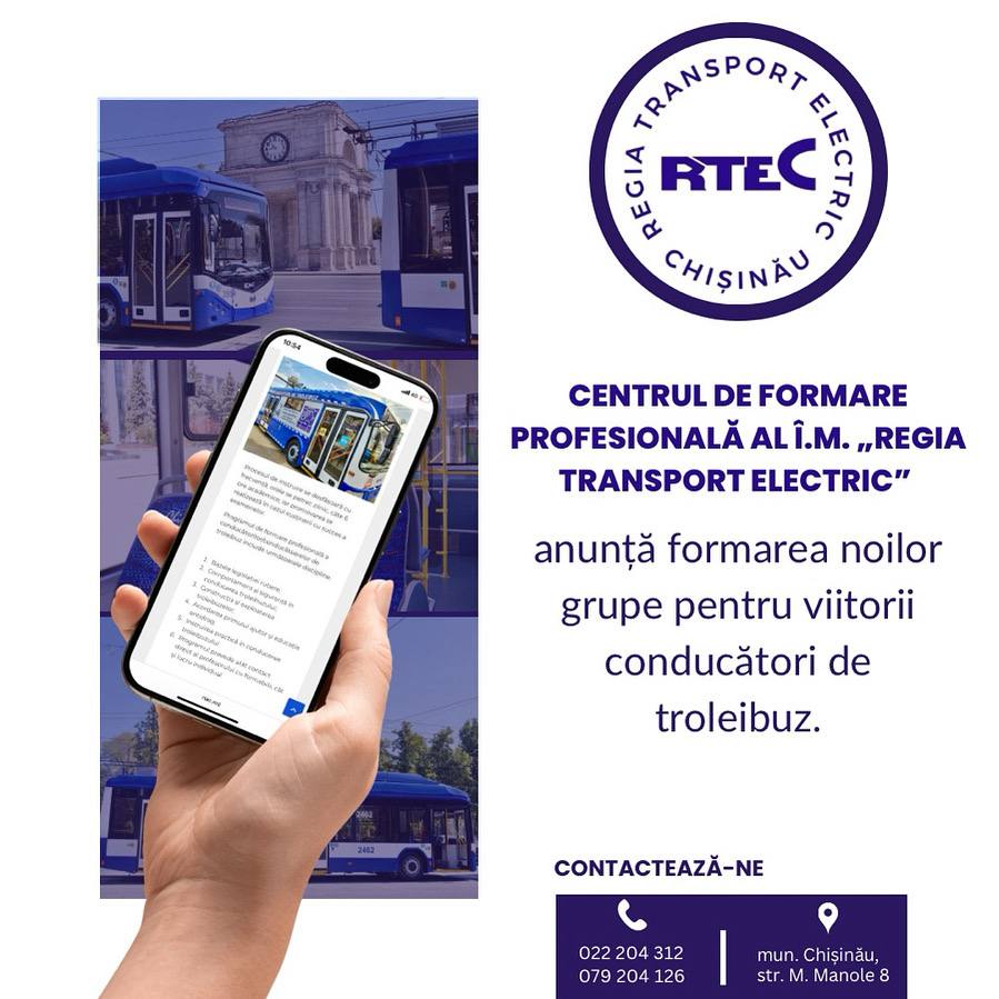 Centrul de Formare Profesională al Î.M. „Regia Transport Electric” anunță deschiderea unei noi grupe de instruire pentru viitorii conducători de troleibuz, cu începerea cursurilor la începutul lunii martie 2026.