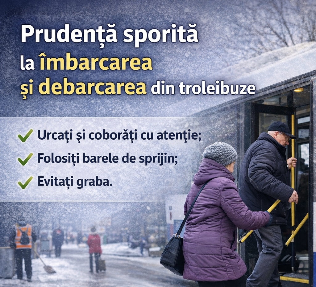 Î.M. „Regia Transport Electric” îndeamnă călătorii să manifeste prudență sporită la îmbarcarea și debarcarea din troleibuze, în contextul condițiilor meteo nefavorabile.
